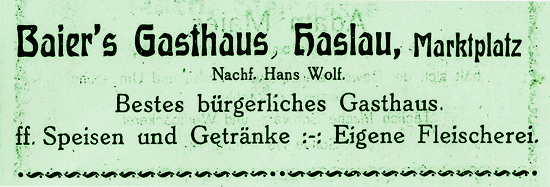 Ein Verzeichnis der Haslauer-Gasthäuser in einzelnen Jahren ist aus der unten aufgeführten Tabelle ersichtlich. Wie man sehen kann, ist deren Anzahl unterschiedlich, je nachdem, ob einige nach und nach geschlossen und andere dann wieder neu eröffnet wurden. Viele von diesen Wirtshäusern waren wohl nur kleine Schänken, die nach dem Betreiber benannt wurden. Die aufgeführten Daten stammen aus den Adressbüchern 1906 bis 1941. Bei den einzelnen Gasthäusern sind nur die grundsätzlichen Informationen erwähnt. Falls jemand diese Angaben korrigieren oder ergänzen möchte, schicke er mir bitte eine Nachricht auf die am Fuß der Seite aufgeführte Email. Ich wäre für jegliche ergänzende Angaben sehr dankbar!