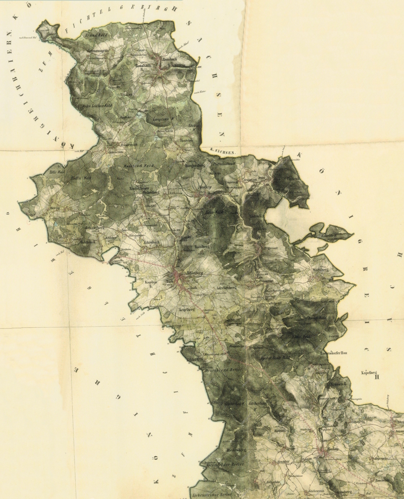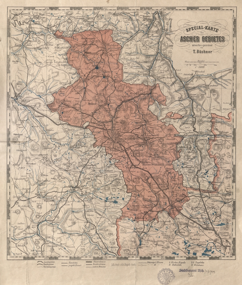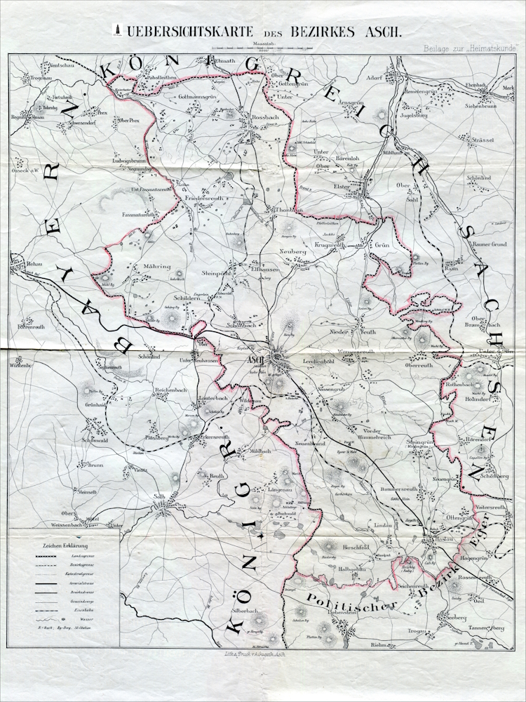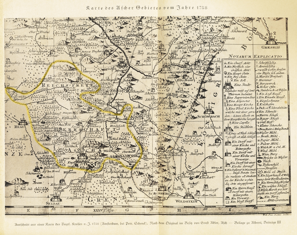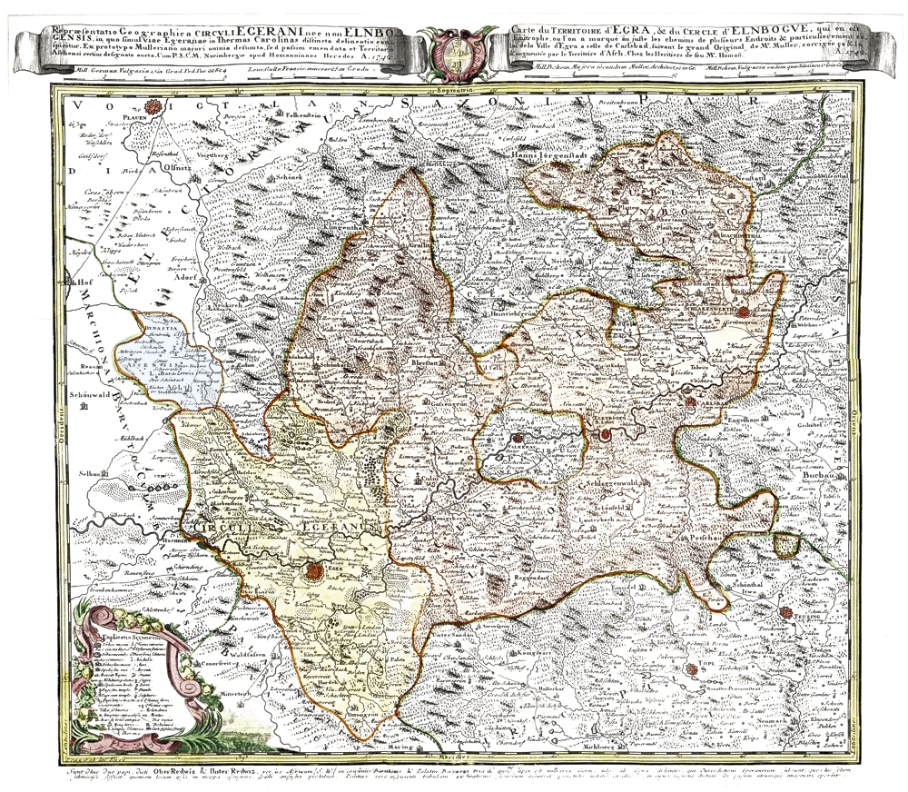 Die große Müller'sche Karte des Königreiches Böhmen wurde in Augsburg in Kupfer gestochen. Sie besteht aus 25 Tafeln, die später von Homanns Erben in Nürnberg auf ein Blatt zusammengezogen wurden. Der Egerische Bezirk reicht auf dieser Karte nur bis Himmelreich, auf der Karte „Egrisch-Reuth“ genannt, während die Zedtwitzische „Herrschaft Asch“ als „Pars Voigtlandiae“ (Teil des Vogtlandes) außerhalb des Egerischen Kreises liegt. Im Homann’schen Atlas vom Jahre 1747 ist das Ascher Gebiet „Dynastia Aschensis Baronia de Zedtwitz“ genannt und durch farbige Grenzen besonders kenntlich gemacht, so daß „von dieser so authentischen Karte der bloße Augenschein gibt, daß das Ascher Gericht Damals nicht zu dem ärgerlichen Bezirk gerechnet wurde.