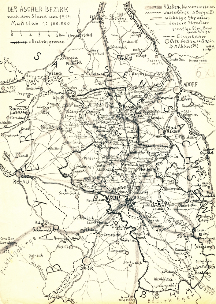 Von den Orten des Asch-Neuberger Zedtwitzischen Gebietes sind auf der Karte verzeichnet: „der Markt Asch, Friedersreuth, Grün, Krugsreuth, Märing, Nassengrub, Niederreuth, Neuberg, Ober Reuth, Roßbach, Wernersreuth und Wustuben", worunter Gottmannsgrün gemeint ist. Gänzlich fehlen Schönbach, Schildern und Thonbrunn. Im südlichen Teil des Bezirkes ist „Haslau, Hirschfeld und Rommersreuth“ angegeben, während Steingrün, Neuenbrand und Himmelreich fehlen; die beiden letzteren sind ja auch erst später gegründet worden.