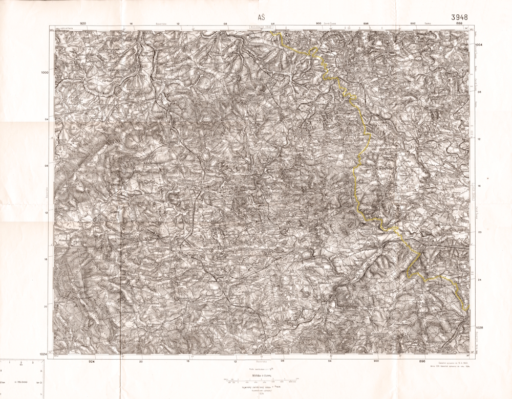 Die Grundlage für diese Karte bildeten die Vorkriegskarten. Alle Ortschaften tragen schon die Tschechischen Namen. Solche Karte waren in den 1948-1989er Jahren streng geheim, um den Flucht nach Westen zu erschweren.